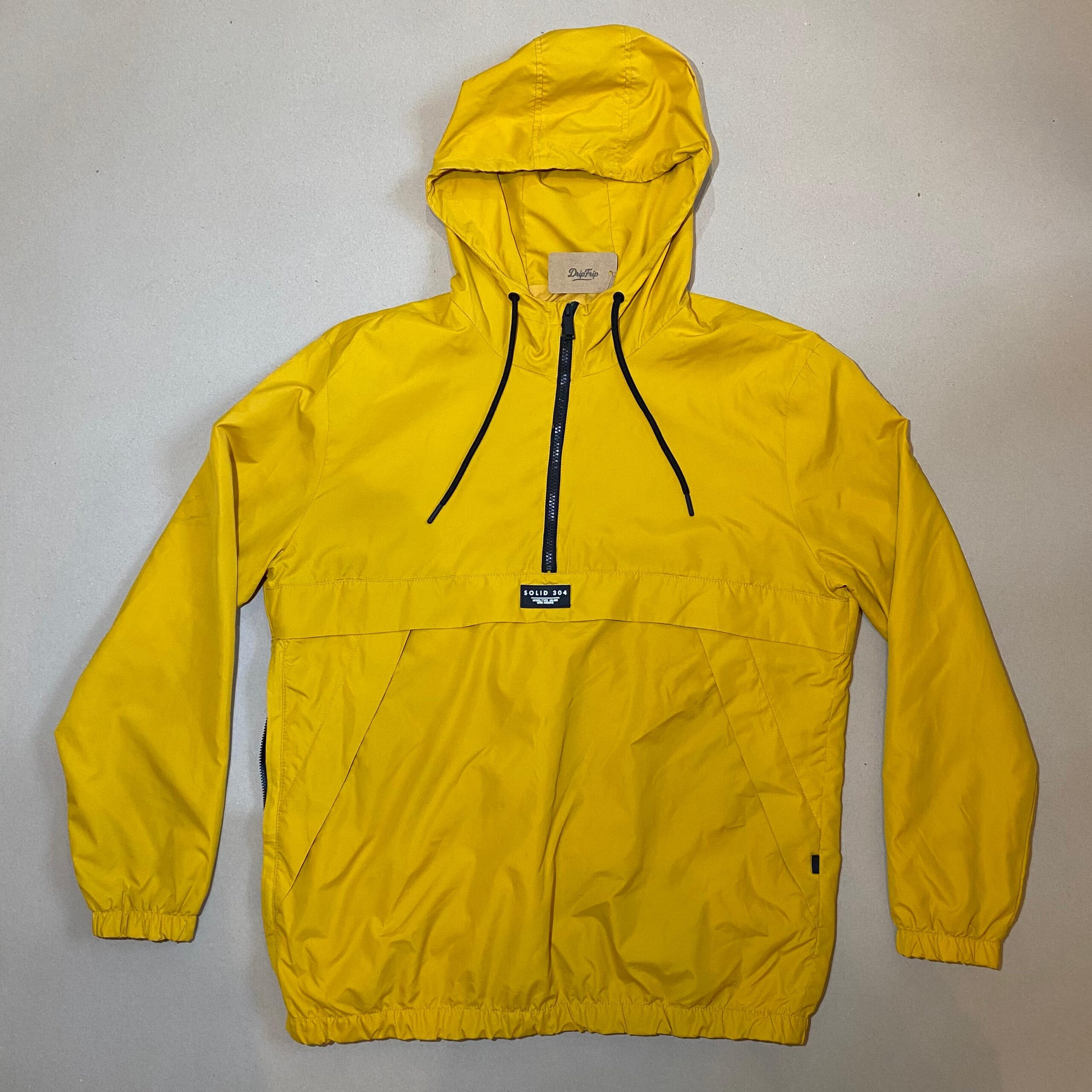 K-way Anorak « Solid 304 » jaune vif à capuche, avec grande poche zippée frontale et fermeture demi-zip.