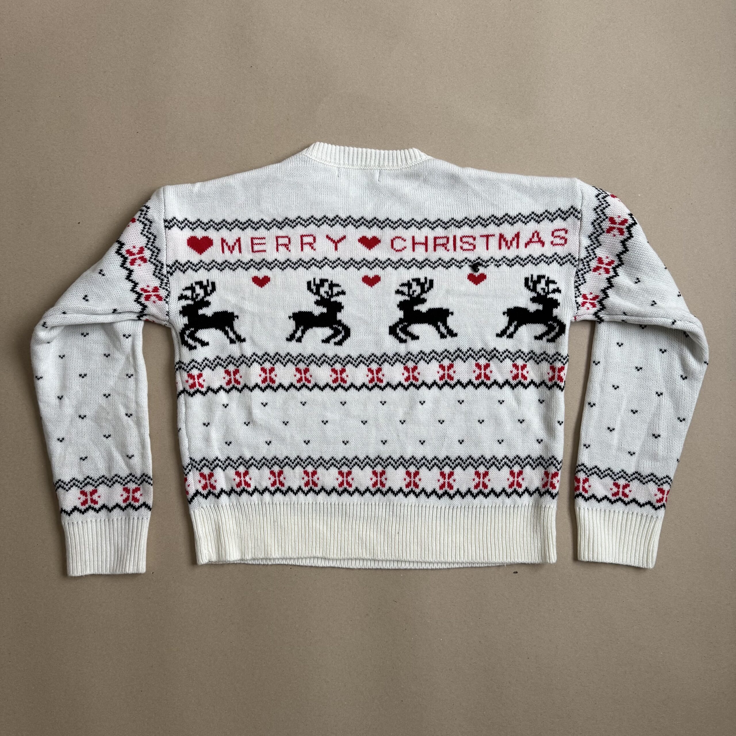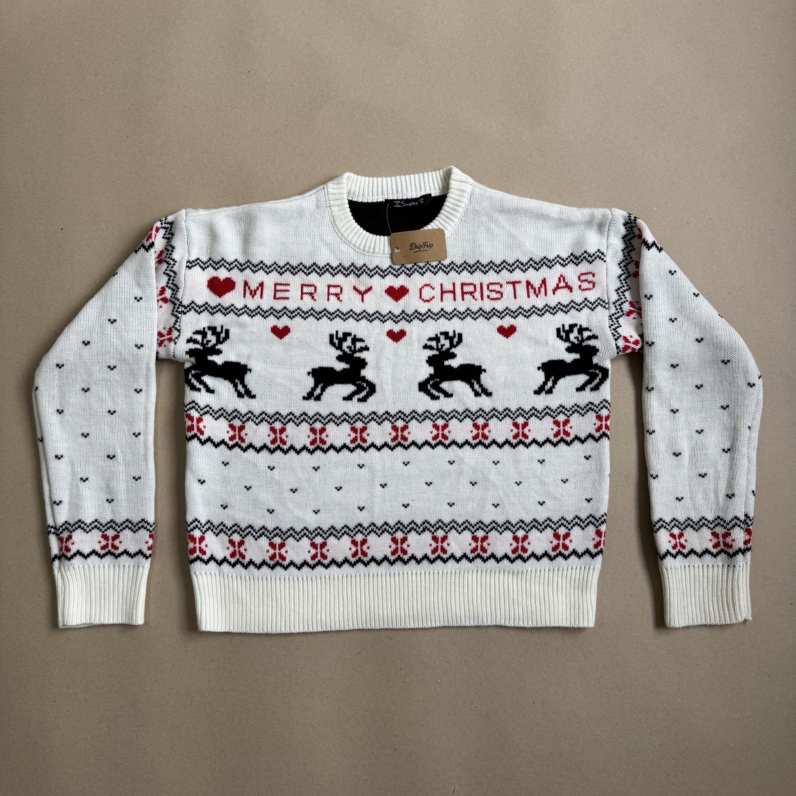 Pull de Noël « Merry Christmas » orné d’un motif complet régulier : rennes, petits cœurs, frises et l’inscription Merry Christmas. Une pièce douce, confortable et ultra festive, idéale pour les soirées d’hiver et les fêtes de fin d’année. Le tricot est agréable, le rendu est propre et la coupe est facile à porter avec n’importe quel bas.