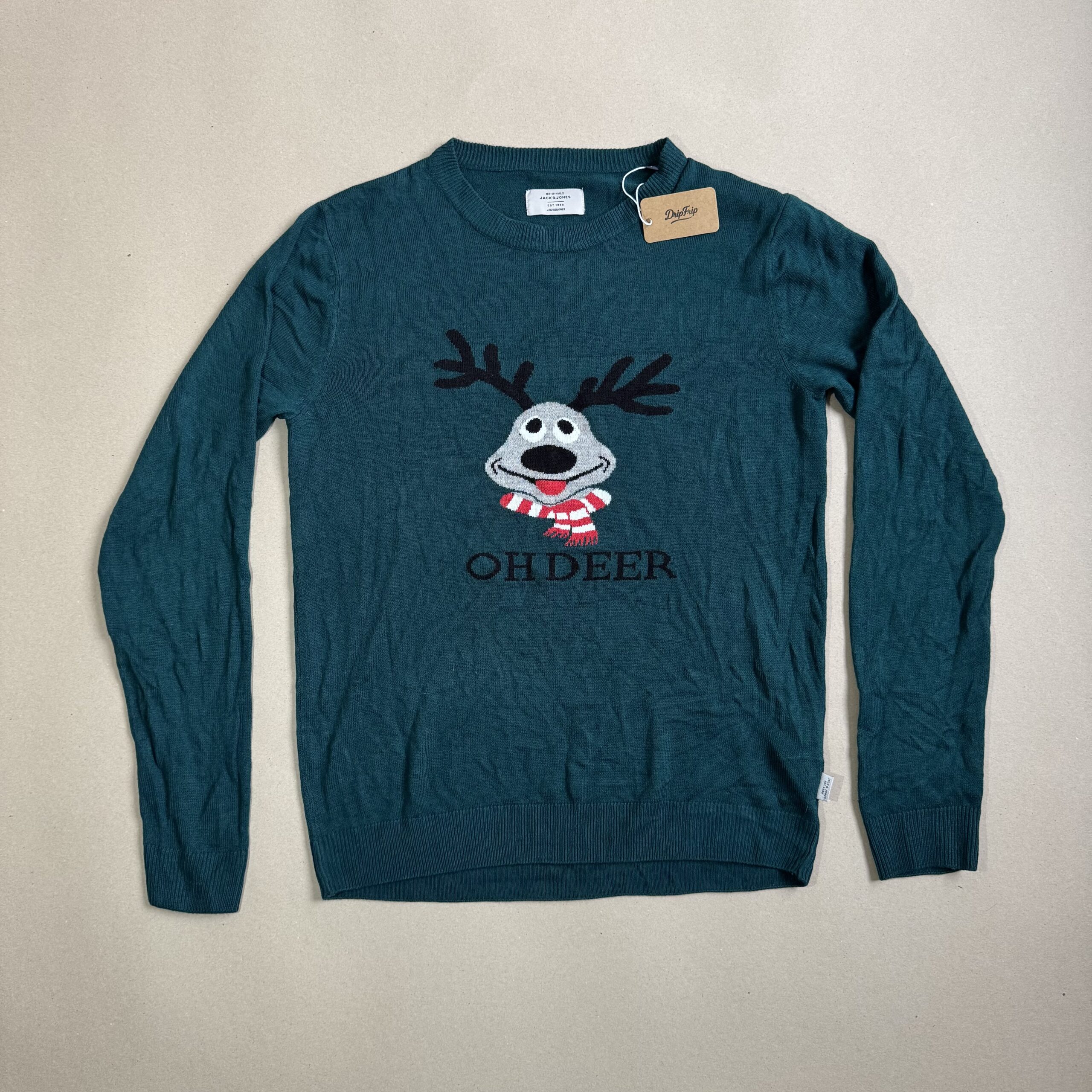 Pull de Noël Renne “OH DEER”  Jack & Jones décoré d’un renne expressif au style drôle et attachant, affichant un large sourire caricatural et des bois noirs contrastants.
