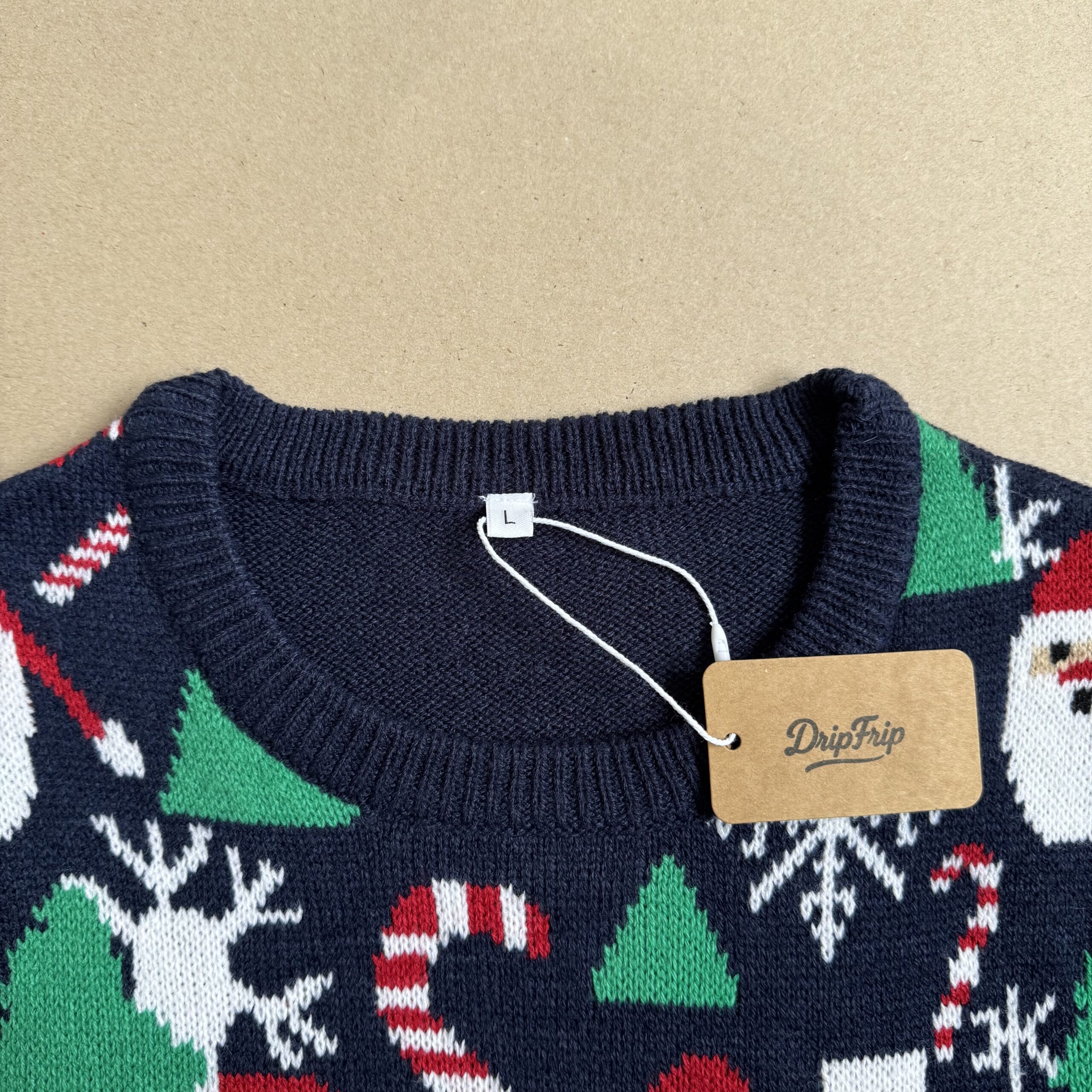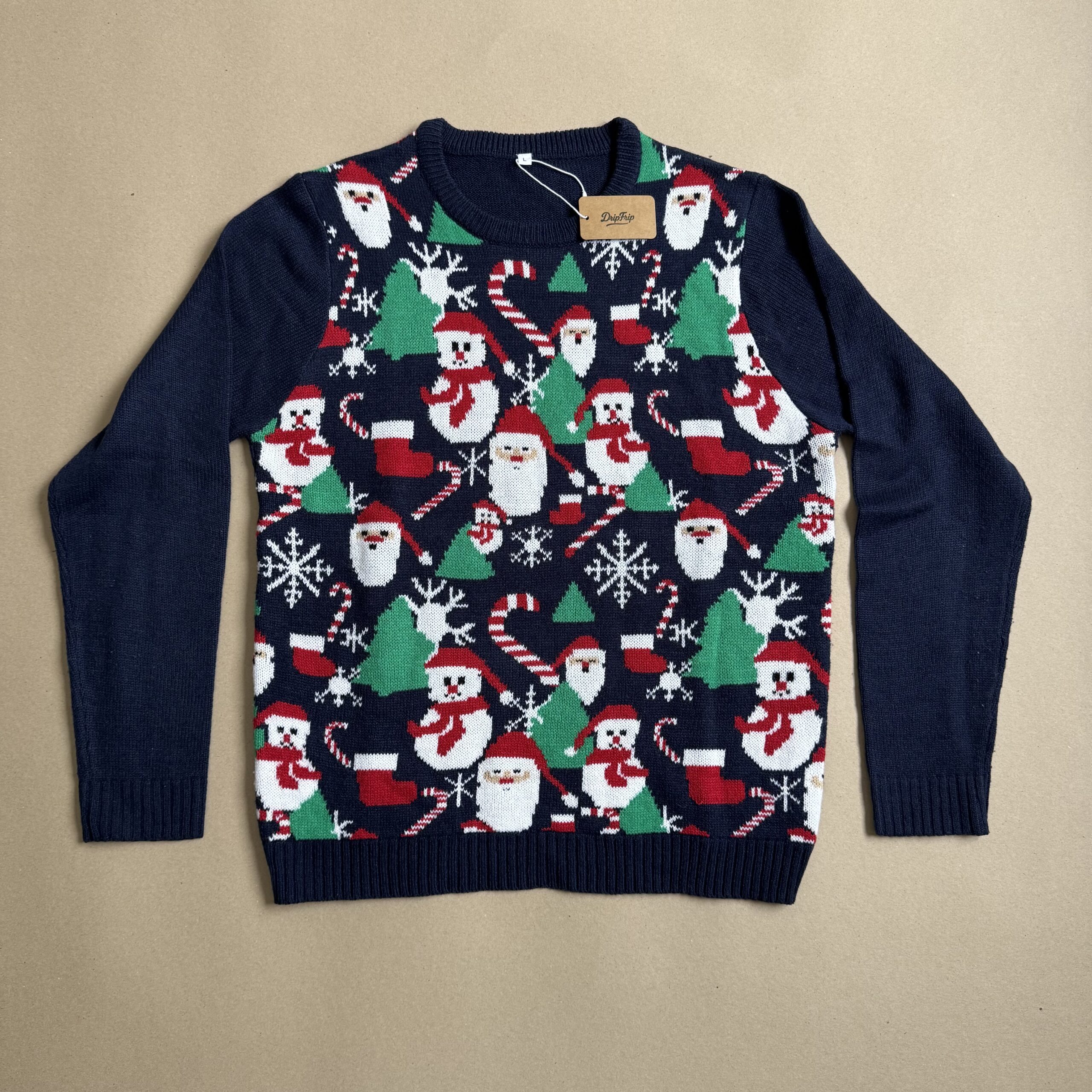 Pull de Noël Santa & Candy Canes affiche un look fun et chargé, parfait pour se démarquer durant les fêtes. Sur un fond bleu marine, on retrouve une multitude de motifs : des Pères Noël expressifs, des sapins verts, des cannes à sucre rouges et blanches, ainsi que des flocons de neige qui viennent compléter ce style typique des pulls d’hiver.